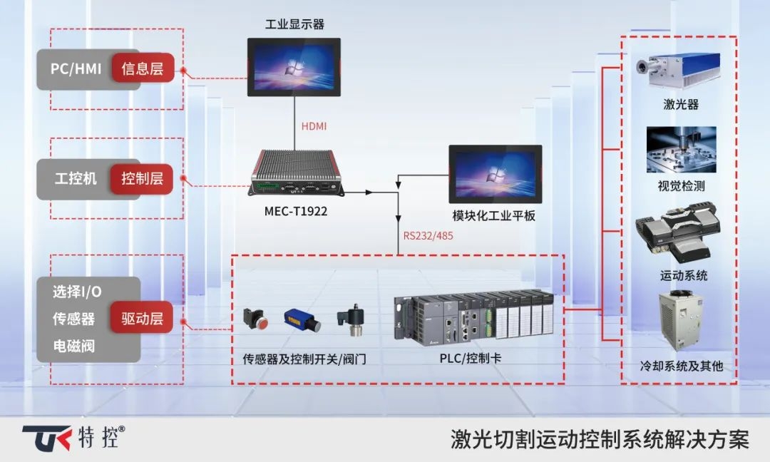 激光切割運動控制系統解決方案以特控工控機MEC -T1922基礎,結合激光器、冷卻系統控制系統等控制數字信號輸入輸出,從而生成控制指令完成復雜的加工,這種切割方式比傳統切割方式更高效、精度更好,也具備切割厚度上的優勢,更能滿足工程機械行業厚板金屬高效率、高精度切割的需要,孕育著高功率激光切割機的廣闊市場。